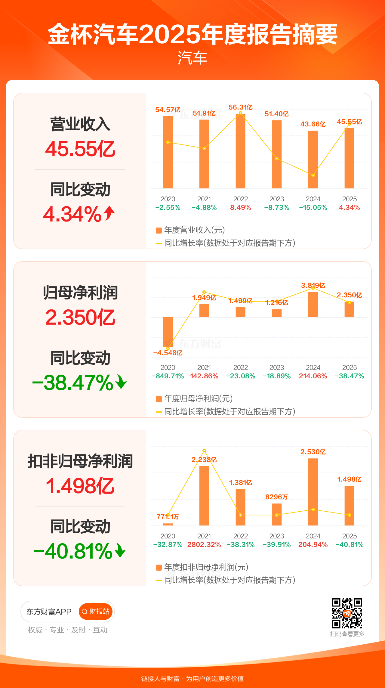 金杯汽车4月11日发布2025年年报显示,公司全年实现营业收入45.55亿元,同比增长4.34%;归母净利润2.35亿元,同比下滑38.47%;扣非归母净利润1.50亿元,同比下滑40.81%。