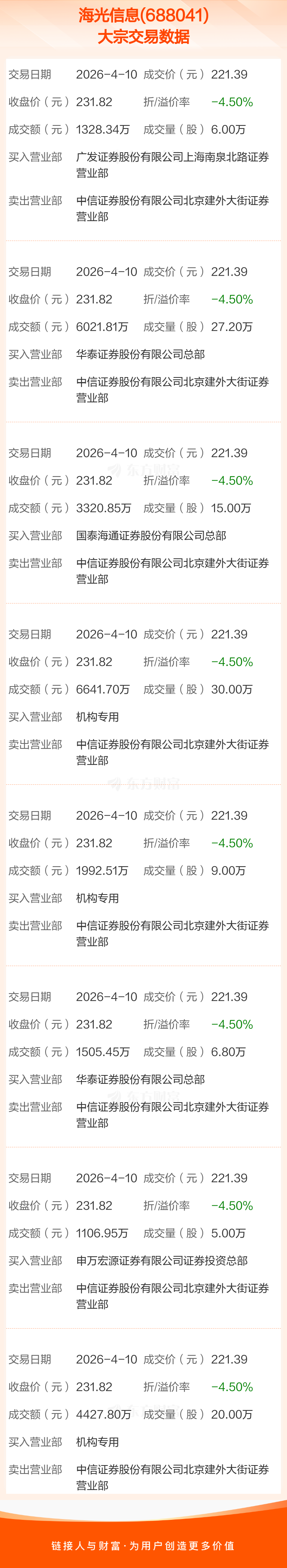 大宗交易:海光信息成交2.63亿元,折价4.50%(4-10)