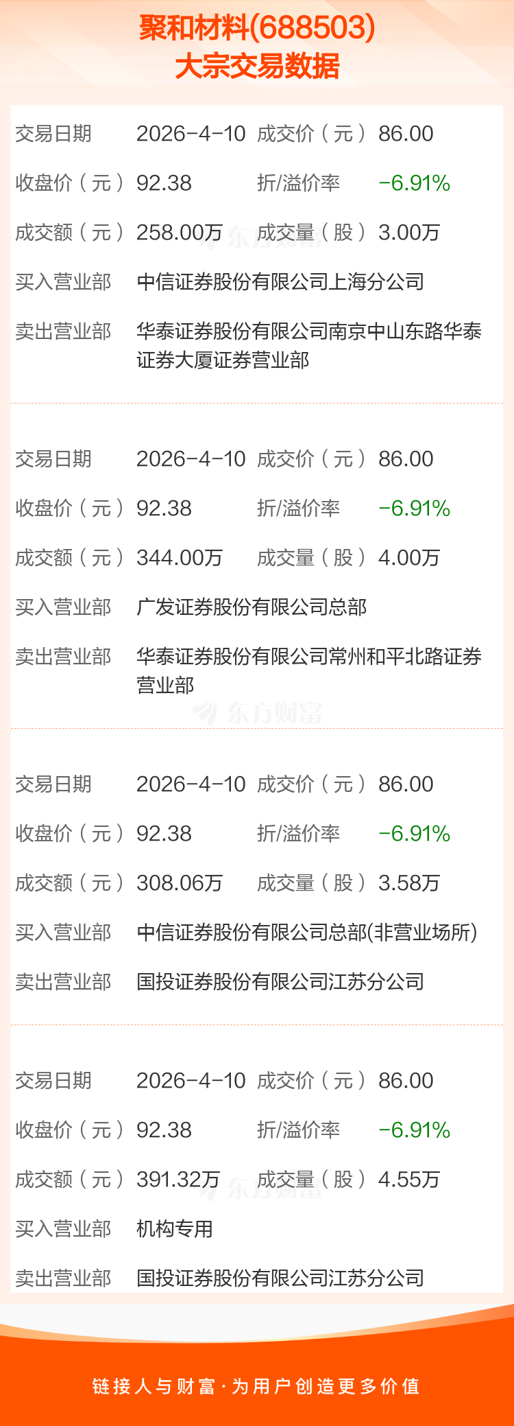 大宗交易:聚和材料成交1301.38万元,折价6.89%(4-10)