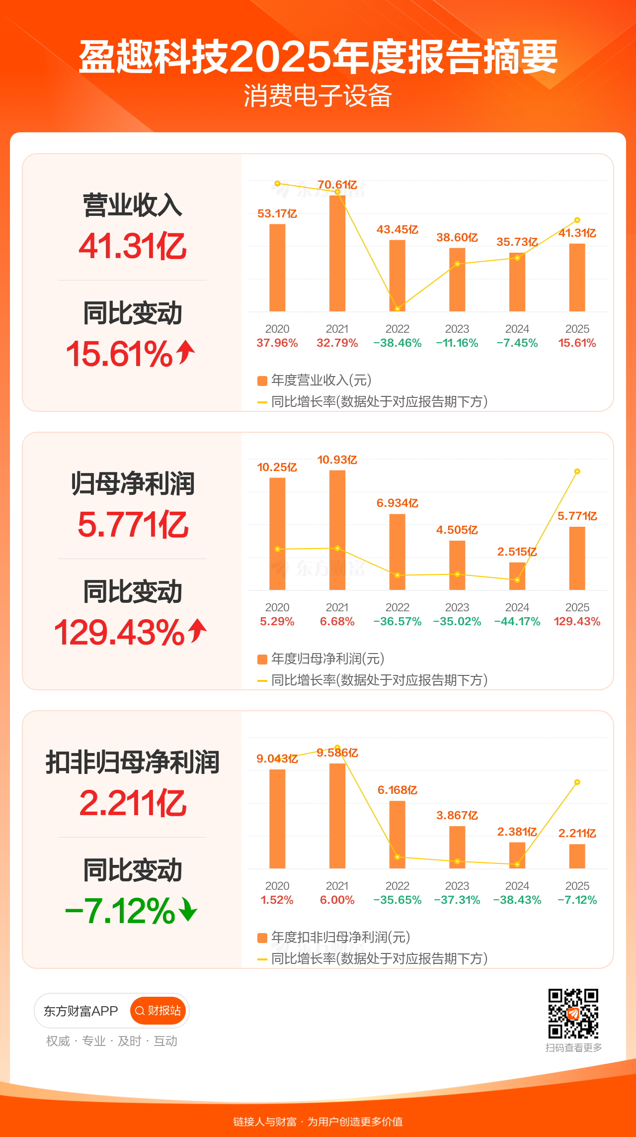 盈趣科技4月11日发布2025年年报显示,公司全年实现营业收入41.31亿元,同比增长15.61%;归母净利润5.77亿元,同比增长129.43%;扣非归母净利润2.21亿元,同比下滑7.12%。