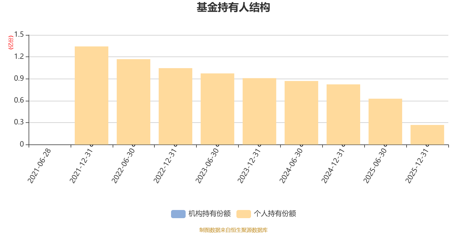 截至2025年12月31日,基金持有人共计497户,合计持有2686.04万份。其中管理人员工持有13.93万份,占比0.52%,机构持有份额占比0.00%,个人投资者占比100.00%。