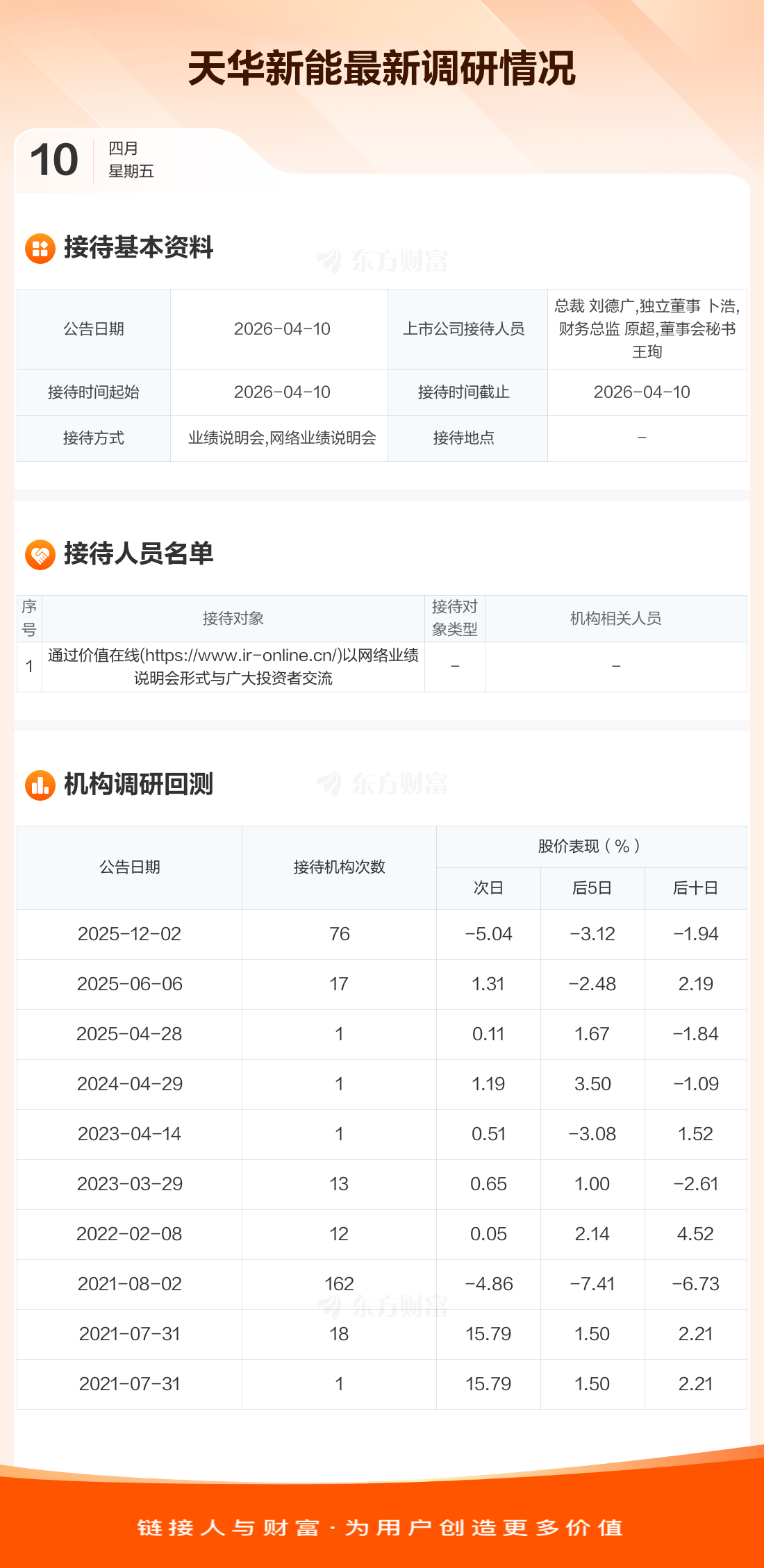 天华新能4月10日公告称,4月10日接待通过价值在线(https://www.ir-online.cn/)以网络业绩说明会形式与广大投资者交流等1家机构调研。接待人员包括总裁 刘德广,独立董事 卜浩,财务总监 原超,董事会秘书 王珣。