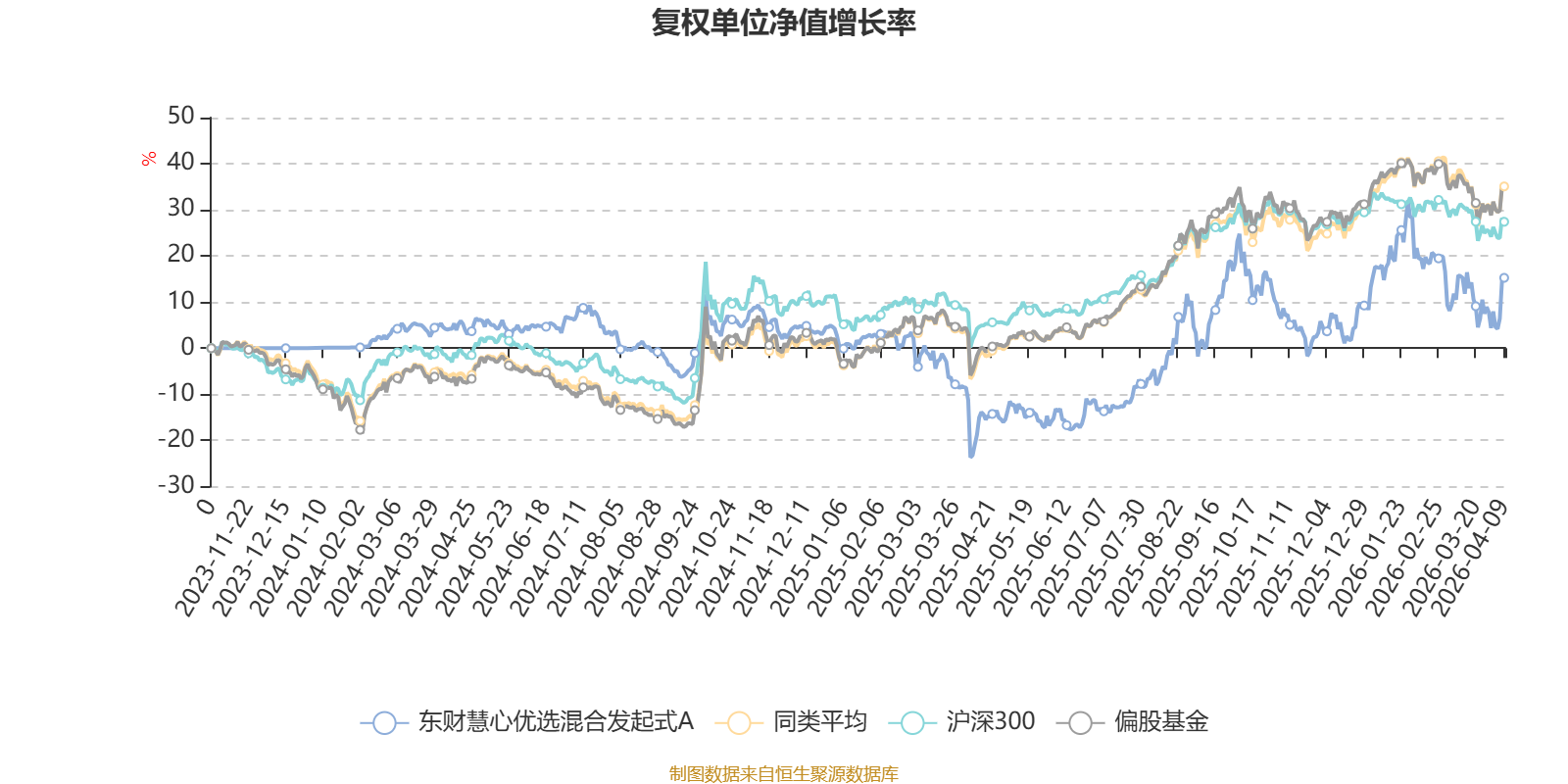 截至4月9日,东财慧心优选混合发起式A近三个月复权单位净值增长率为-1.82%,位于同类可比基金375/689;近半年复权单位净值增长率为-7.64%,位于同类可比基金560/689;近一年复权单位净值增长率为45.81%,位于同类可比基金253/685。