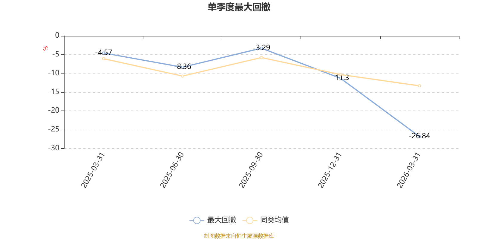 截至4月9日,基金成立以来最大回撤为27.15%。单季度最大回撤出现在2026年一季度,为26.84%。