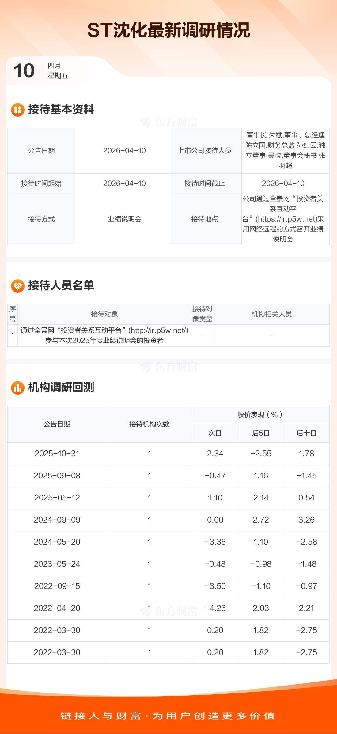ST沈化4月10日公告称,4月10日接待通过全景网“投资者关系互动平台”(http://ir.p5w.net/)参与本次2025年度业绩说明会的投资者等1家机构调研。接待人员包括董事长 朱斌,董事、总经理 陈立国,财务总监 孙红云,独立董事 吴粒,董事会秘书 张羽超。