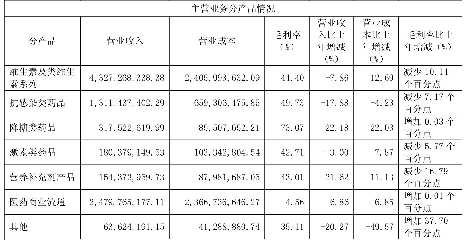 分产品来看,2025年,浙江医药维生素及类维生素系列产品、抗感染类药品、激素类药品、营养补充剂产品、其他产品营收同比分别减少7.86%、17.88%、3%、21.62%、20.27%,降糖类药品、医药商业流通产品营收则同比分别增长22.18%、6.86%。