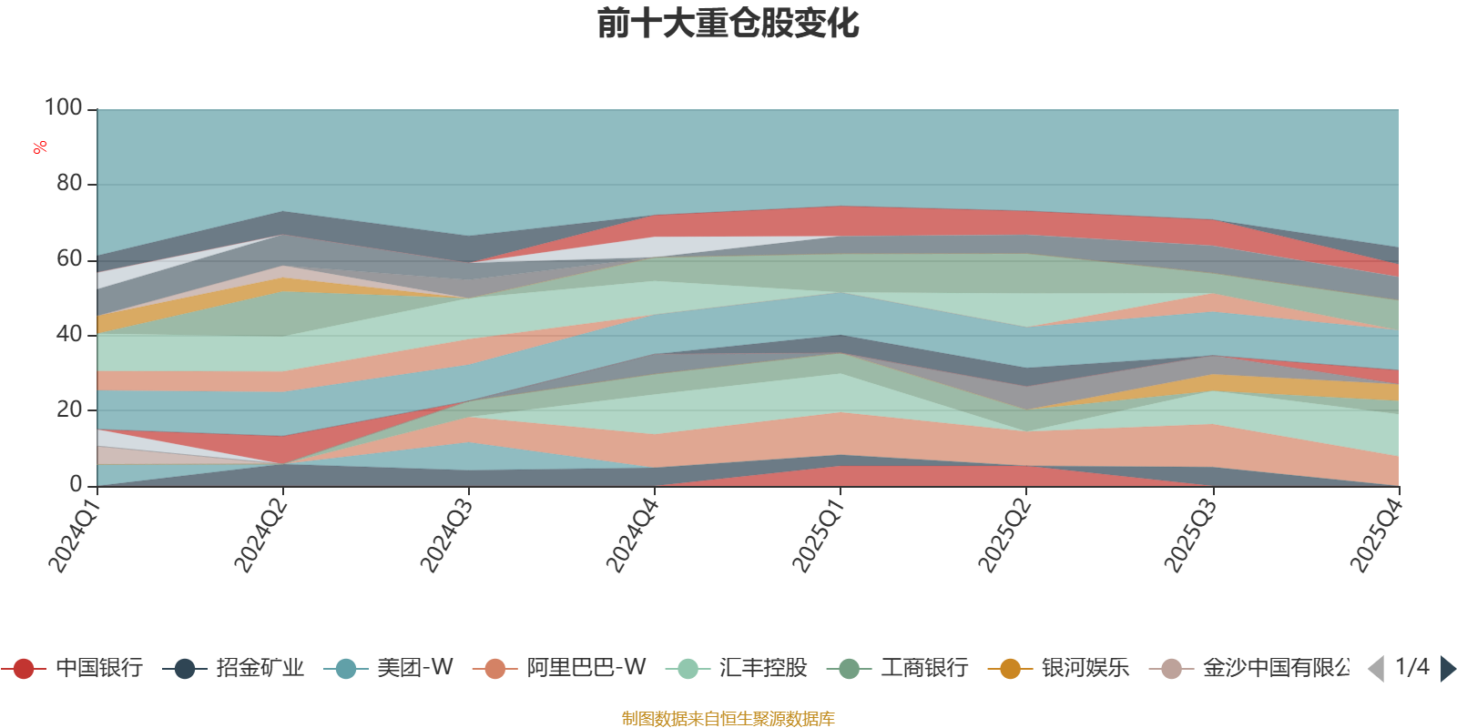 该基金持股集中度较高,近2年前十大重仓股集中度长期超过60%。截至2025年末,基金十大重仓股分别是汇丰控股、腾讯控股、中国移动、阿里巴巴-W、紫金矿业、友邦保险、银河娱乐、中国海洋石油、工商银行、中芯国际。