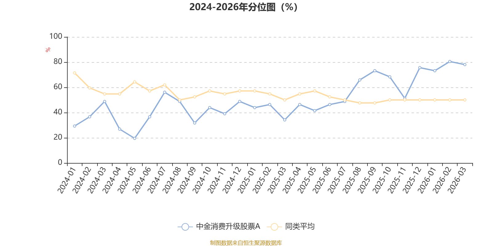 通过所选区间该基金净值增长率分位图,可以观察该基金与同类基金业绩比较情况。图为坐标原点到区间内某时点的净值增长率在同类基金中的分位数。