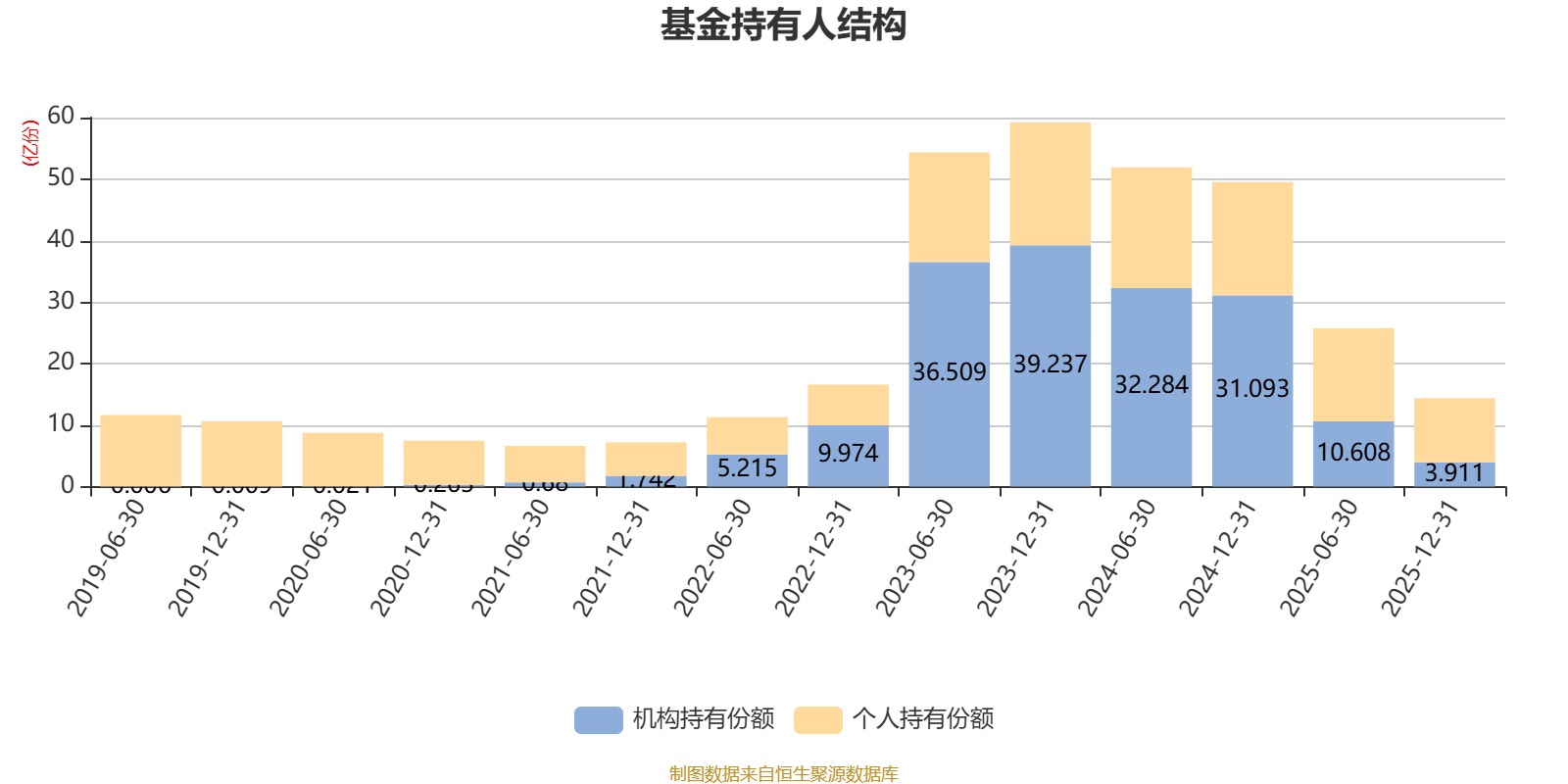 截至2025年12月31日,基金持有人共计19.07万户,合计持有14.38亿份。其中管理人员工持有290.75万份,占比0.20%,机构持有份额占比27.20%,个人投资者占比72.80%。