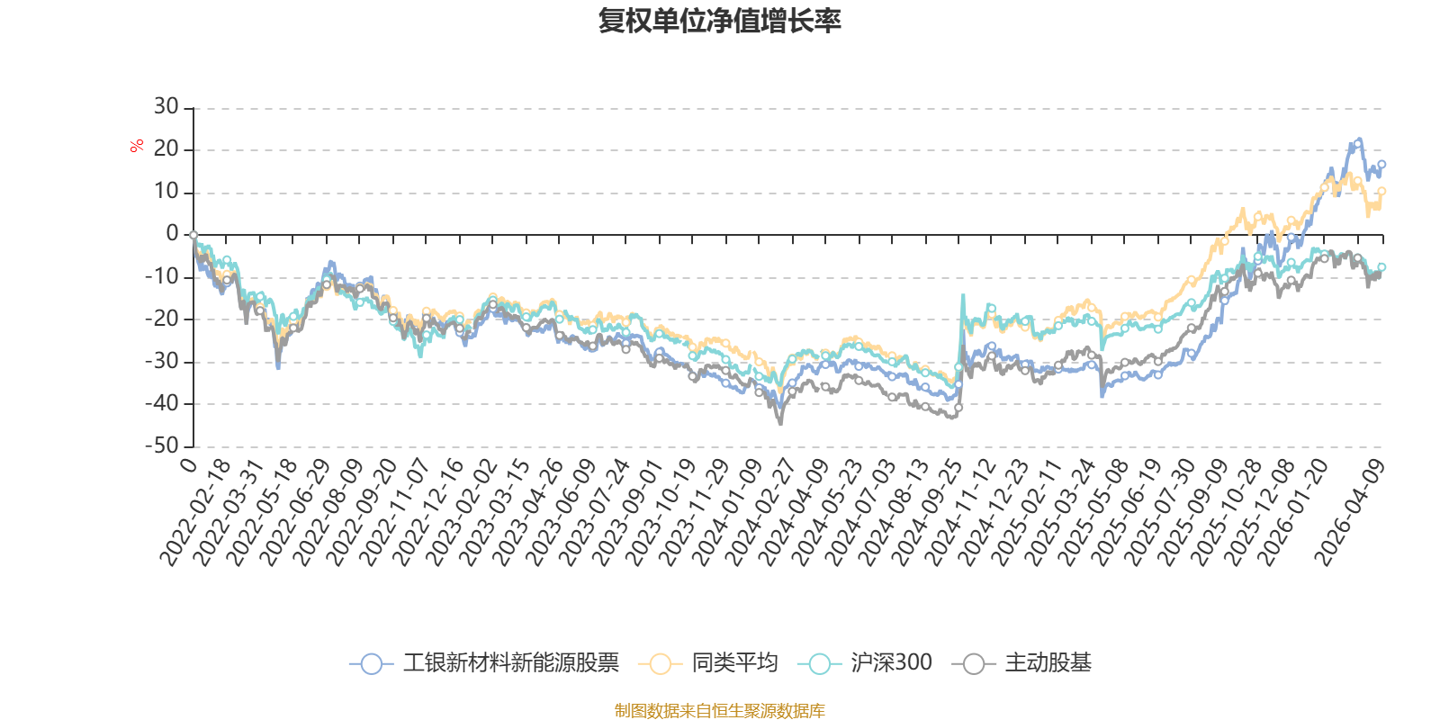 截至4月9日,工银新材料新能源股票近三个月复权单位净值增长率为8.92%,位于同类可比基金5/58;近半年复权单位净值增长率为20.18%,位于同类可比基金2/58;近一年复权单位净值增长率为85.19%,位于同类可比基金4/57;近三年复权单位净值增长率为50.35%,位于同类可比基金10/57。