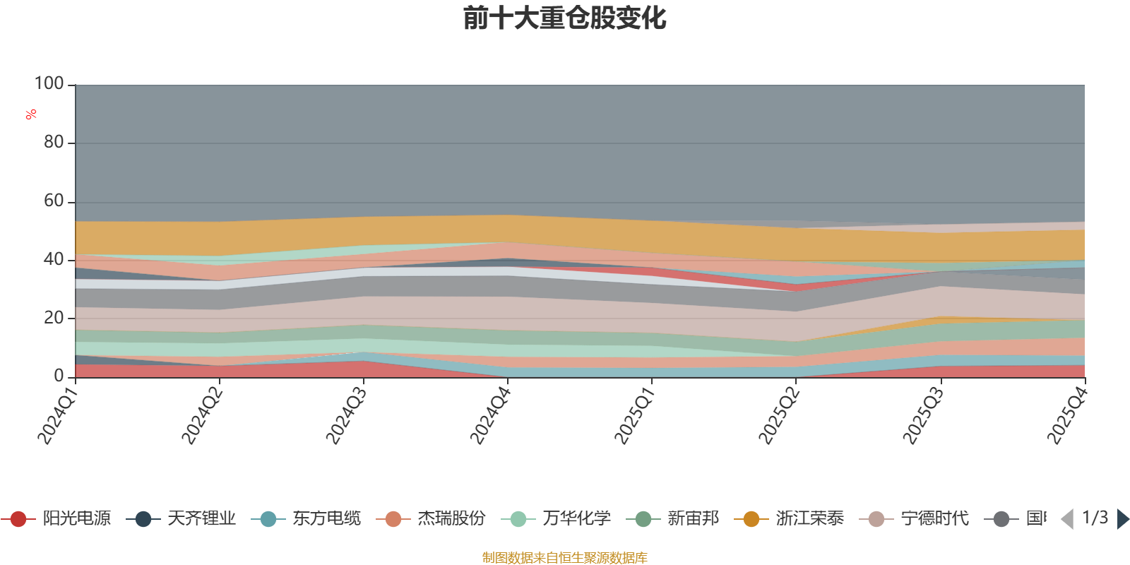 该基金持股集中度较高。截至2025年末,基金十大重仓股分别是紫金矿业、宁德时代、杰瑞股份、新宙邦、国电南瑞、阳光电源、中矿资源、东方电缆、厦钨新能、中国石油。