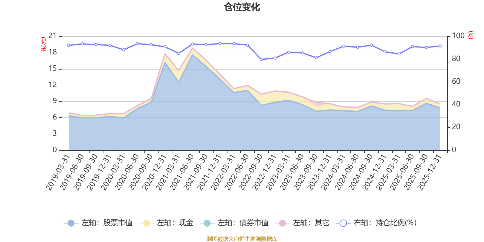 据定期报告数据统计,近三年平均股票仓位为88.06%,同类平均为88.27%。2021年末基金达到93.57%的最高仓位,2022年三季度末最低,为79.7%。