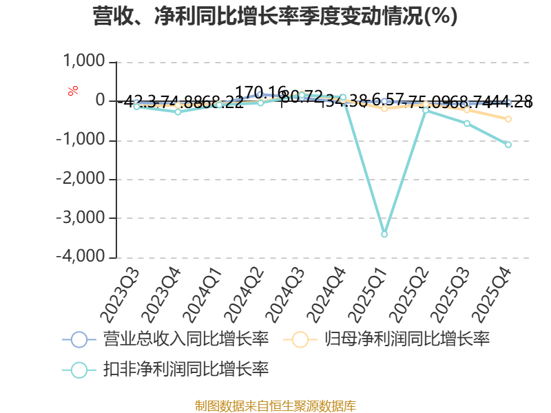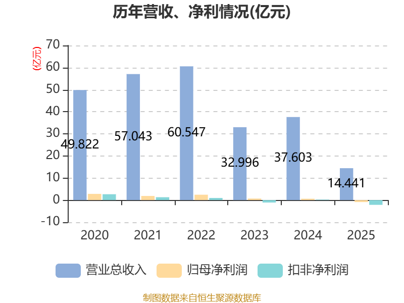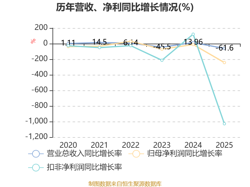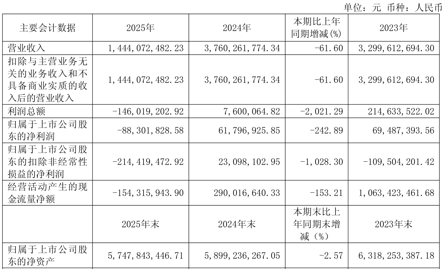 中证智能财讯香江控股(600162)4月11日披露2025年年度报告。2025年,公司实现营业总收入14.44亿元,同比下降61.60%;归母净利润亏损8830.18万元,上年同期盈利6179.69万元;扣非净利润亏损2.14亿元,上年同期盈利2309.81万元;经营活动产生的现金流量净额为-1.54亿元,上年同期为2.9亿元;报告期内,香江控股基本每股收益为-0.0271元,加权平均净资产收益率为-1.52%。公司2025年度分配预案为:拟向全体股东每10股派现0.05元(含税)。