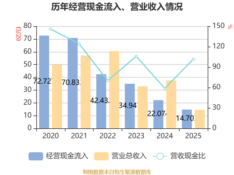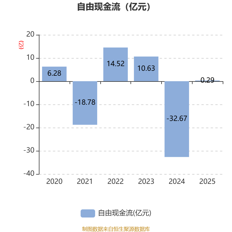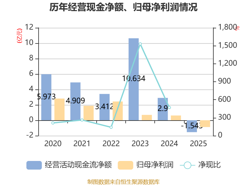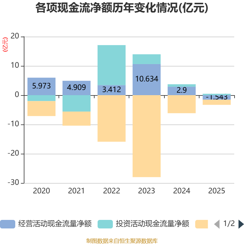 截至2025年,公司经营活动现金流净额为-1.54亿元,同比减少4.44亿元;筹资活动现金流净额-1.76亿元,同比增加4.4亿元;投资活动现金流净额4692.08万元,上年同期为8247.37万元。