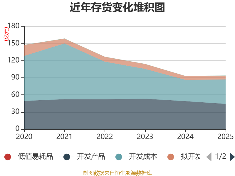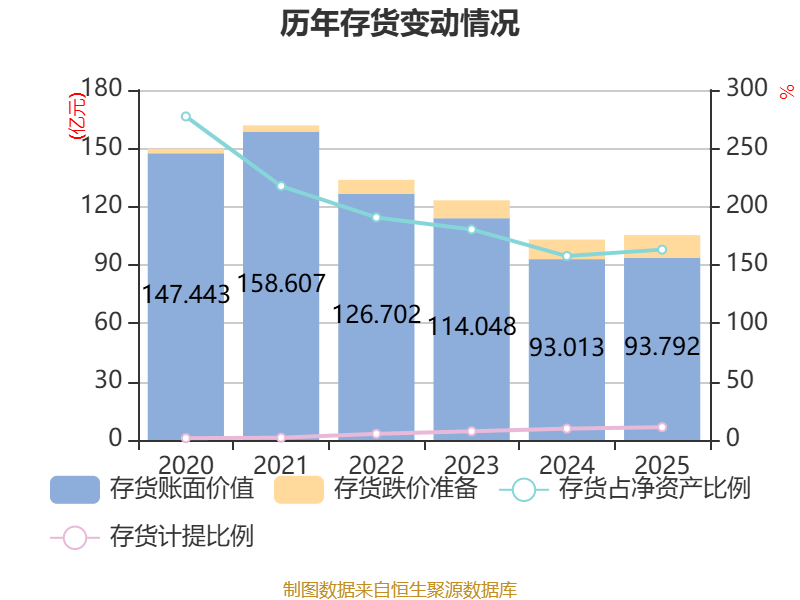 从存货变动来看,截至2025年末,公司存货账面价值为93.79亿元,占净资产的163.18%,较上年末增加7785.02万元。其中,存货跌价准备为11.57亿元,计提比例为10.98%。