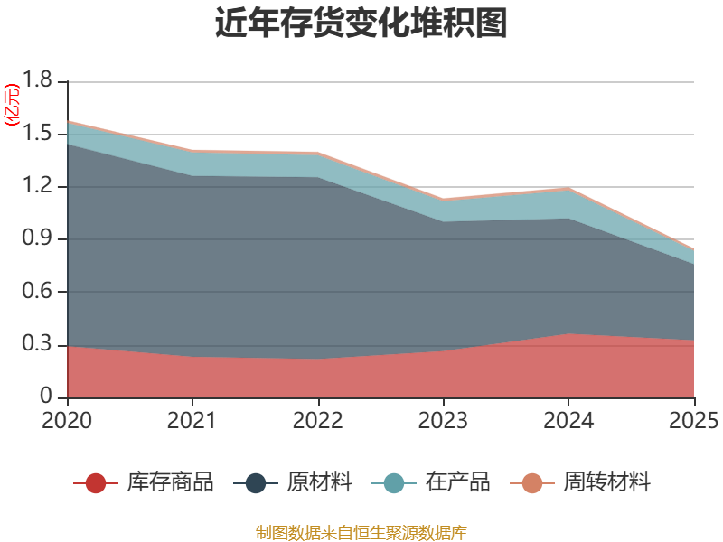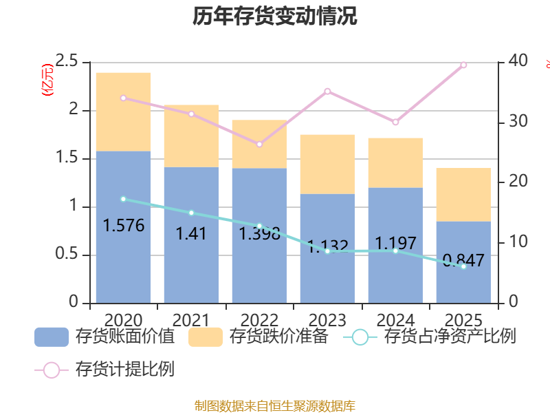 从存货变动来看,截至2025年末,公司存货账面价值为8469.64万元,占净资产的6.04%,较上年末减少3496.83万元。其中,存货跌价准备为5528.95万元,计提比例为39.5%。