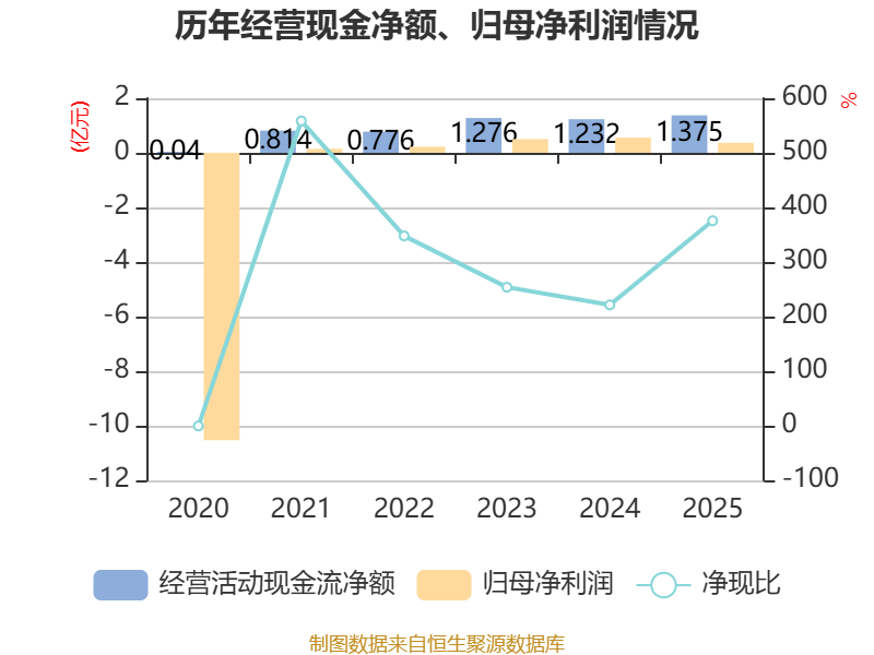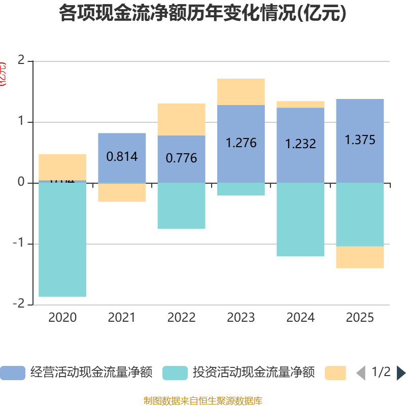 截至2025年,公司经营活动现金流净额为1.38亿元,同比增长11.63%;筹资活动现金流净额-3569.67万元,同比减少4642.22万元;投资活动现金流净额-1.05亿元,上年同期为-1.21亿元。