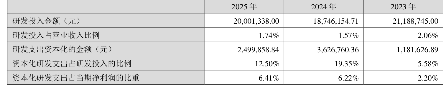 2025年全年,公司研发投入金额为2000.13万元,同比增长6.7%;研发投入占营业收入比例为1.74%,相比上年同期上升0.17个百分点。此外,公司全年研发投入资本化率为12.5%。