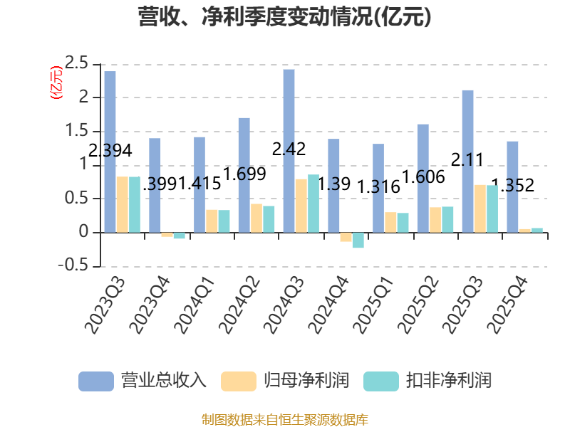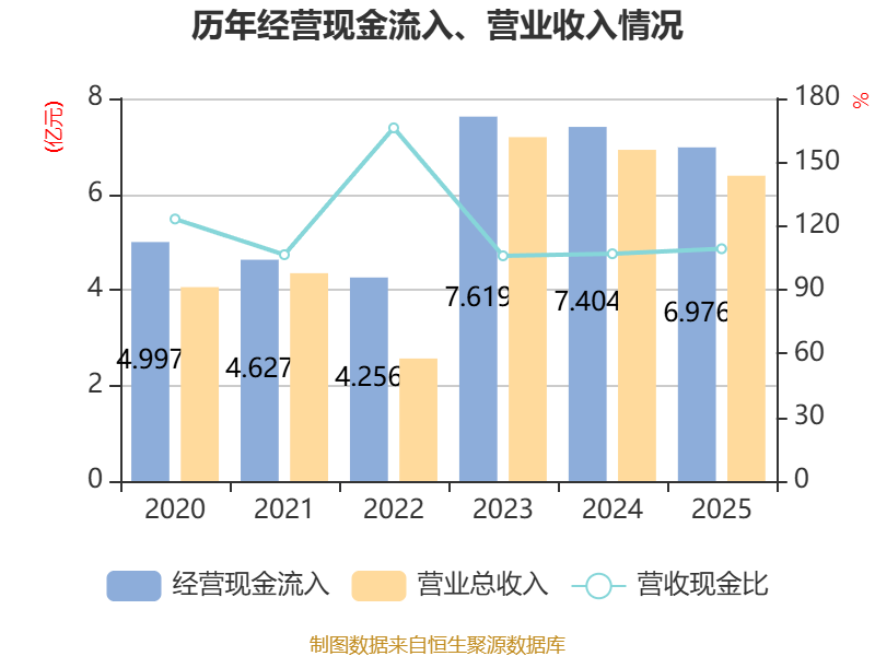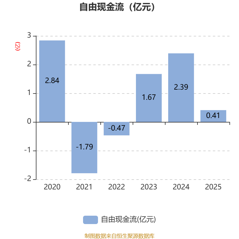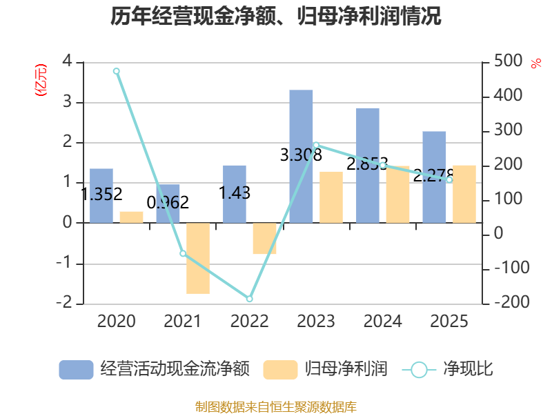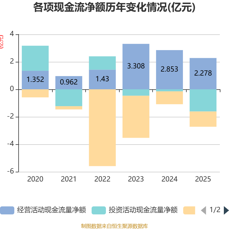 截至2025年,公司经营活动现金流净额为2.28亿元,同比下降20.14%;筹资活动现金流净额-1.11亿元,同比减少1725.7万元;投资活动现金流净额-1.61亿元,上年同期为-1481.78万元。