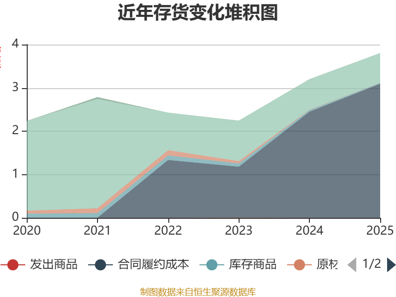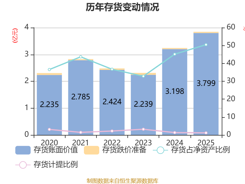 从存货变动来看,截至2025年末,公司存货账面价值为3.8亿元,占净资产的50.46%,较上年末增加6011.24万元。其中,存货跌价准备为444.53万元,计提比例为1.16%。