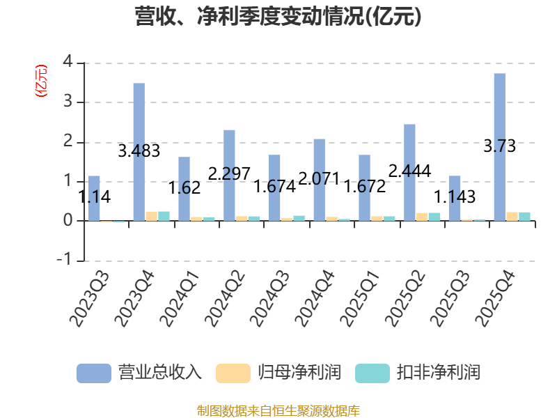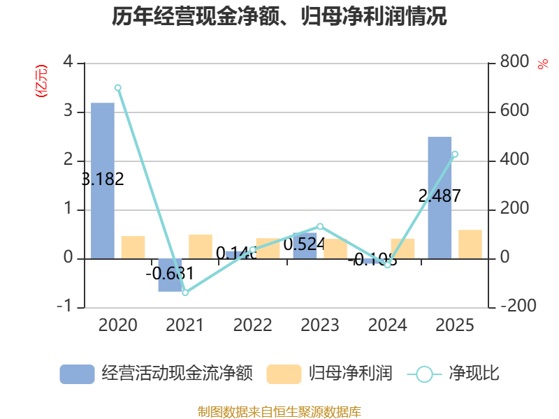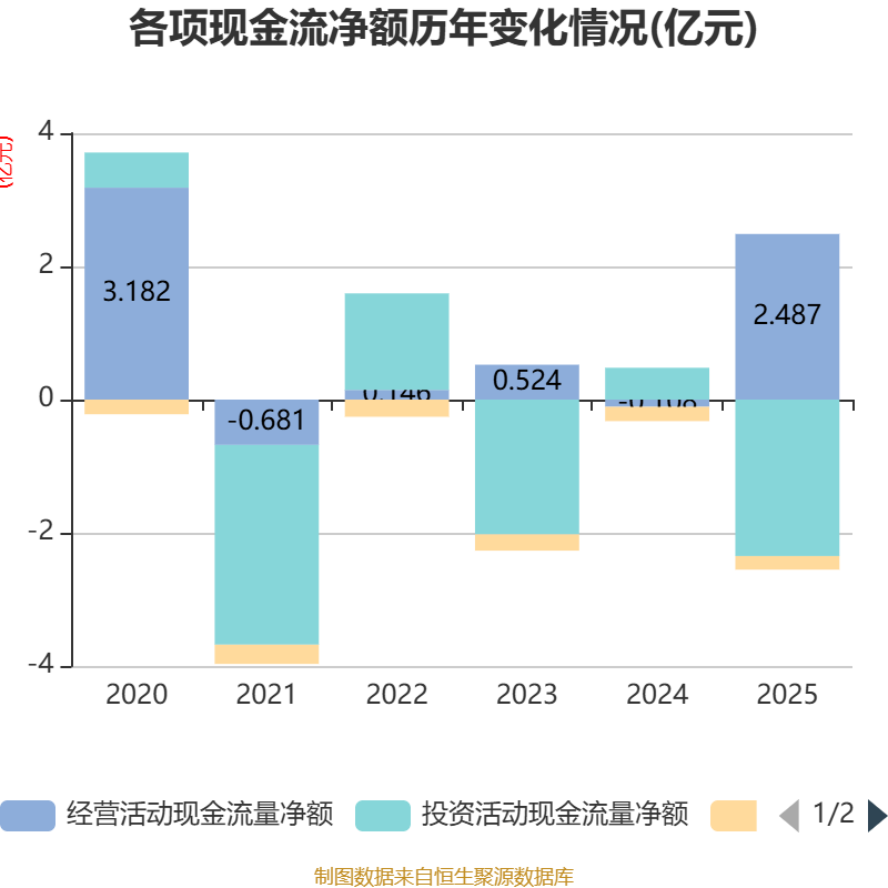 截至2025年,公司经营活动现金流净额为2.49亿元,同比增加2.6亿元;筹资活动现金流净额-2035.42万元,同比增加117.18万元;投资活动现金流净额-2.35亿元,上年同期为4777.41万元。