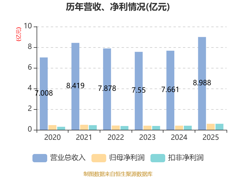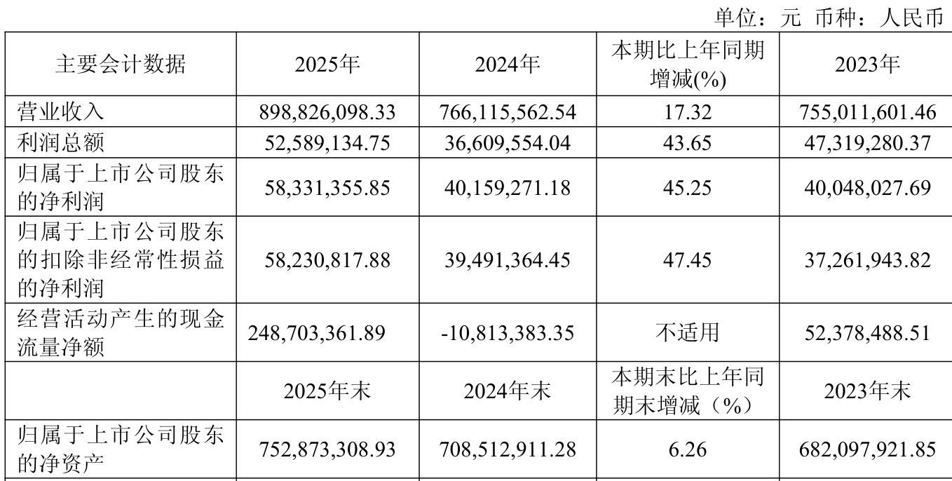 中证智能财讯国机通用(600444)4月11日披露2025年年度报告。2025年,公司实现营业总收入8.99亿元,同比增长17.32%;归母净利润5833.14万元,同比增长45.25%;扣非净利润5823.08万元,同比增长47.45%;经营活动产生的现金流量净额为2.49亿元,上年同期为-1081.34万元;报告期内,国机通用基本每股收益为0.3984元,加权平均净资产收益率为7.98%。公司2025年度分配预案为:拟向全体股东每10股派现1.6元(含税)。