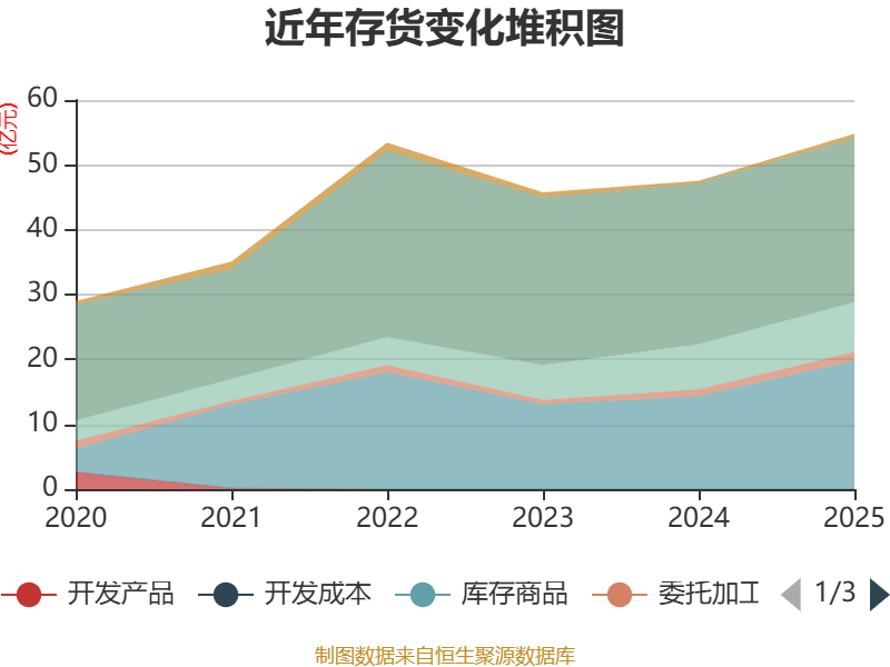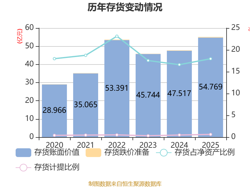 从存货变动来看,截至2025年末,公司存货账面价值为54.77亿元,占净资产的17.96%,较上年末增加7.25亿元。其中,存货跌价准备为3401.48万元,计提比例为0.62%。