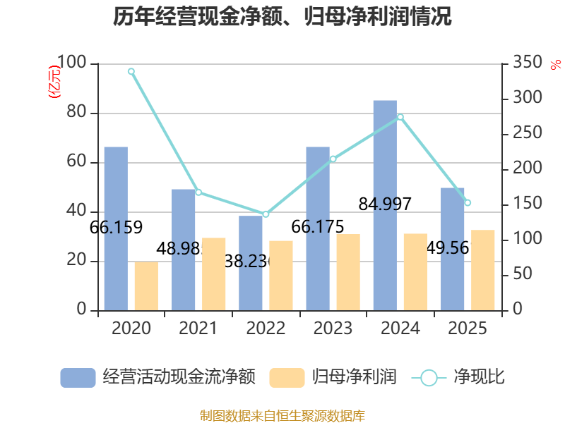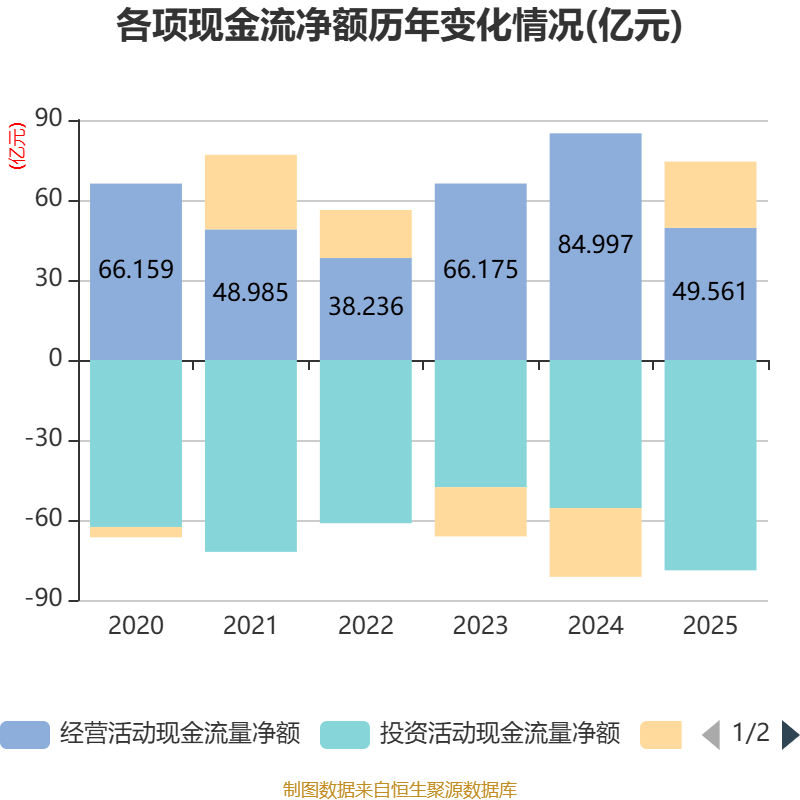 截至2025年,公司经营活动现金流净额为49.56亿元,同比下降41.69%;筹资活动现金流净额24.84亿元,同比增加50.64亿元;投资活动现金流净额-78.88亿元,上年同期为-55.5亿元。