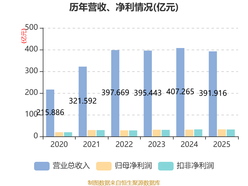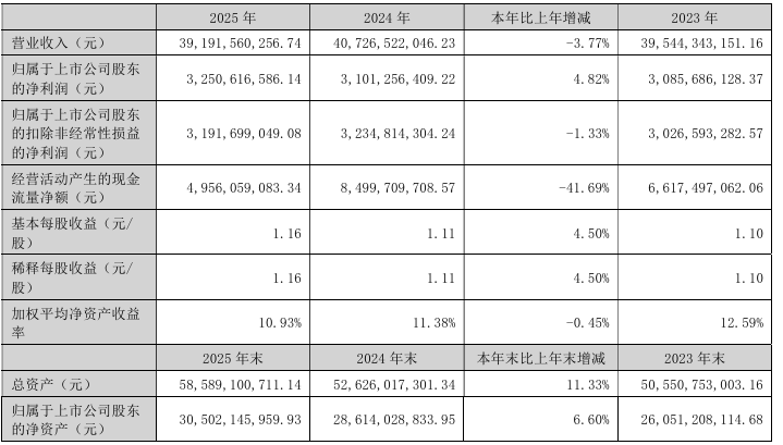 中证智能财讯太阳纸业(002078)4月11日披露2025年年度报告。2025年,公司实现营业总收入391.92亿元,同比下降3.77%;归母净利润32.51亿元,同比增长4.82%;扣非净利润31.92亿元,同比下降1.33%;经营活动产生的现金流量净额为49.56亿元,同比下降41.69%;报告期内,太阳纸业基本每股收益为1.16元,加权平均净资产收益率为10.93%。公司2025年度分配预案为:拟向全体股东每10股派现2元(含税)。