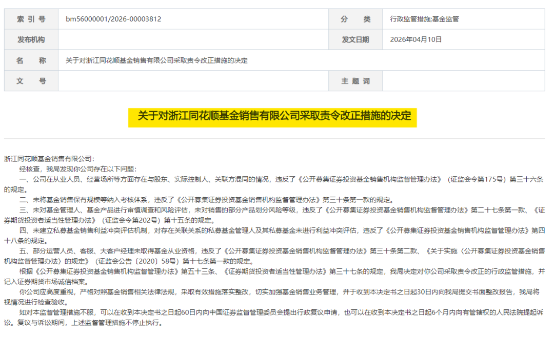 4月10日,浙江证监局发布关于对浙江同花顺基金销售有限公司采取责令改正措施的决定。