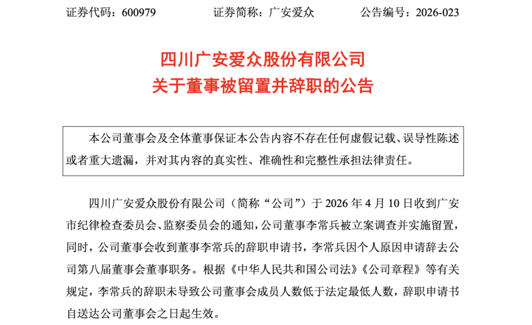 4月10日,广安爱众发布公告称,公司董事李常兵被立案调查并实施留置。同时,李常兵因个人原因申请辞去公司第八届董事会董事职务。