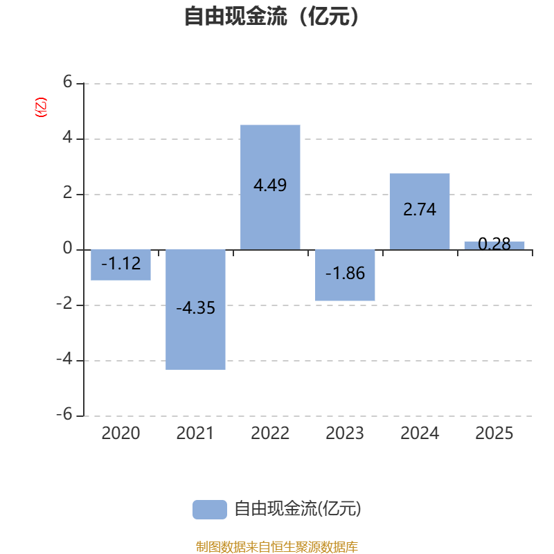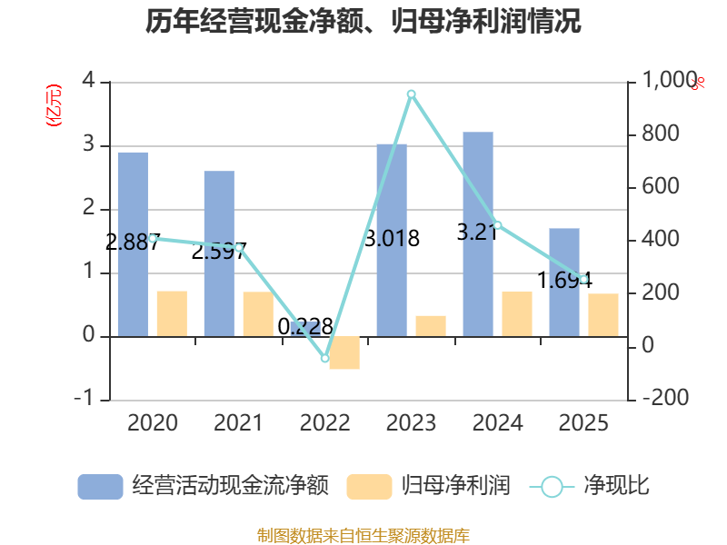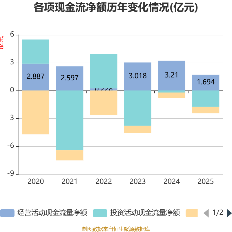 截至2025年,公司经营活动现金流净额为1.69亿元,同比下降47.22%;筹资活动现金流净额-7126.86万元,同比减少928.73万元;投资活动现金流净额-1.75亿元,上年同期为-2198.96万元。