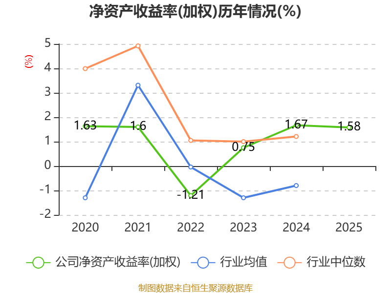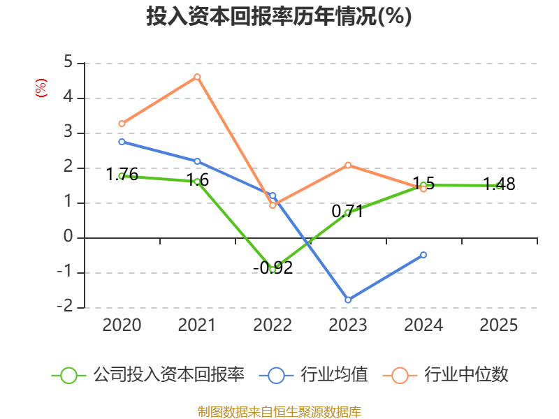 数据显示,2025年公司加权平均净资产收益率为1.58%,较上年同期下降0.09个百分点。公司2025年投入资本回报率为1.48%,较上年同期下降0.02个百分点。