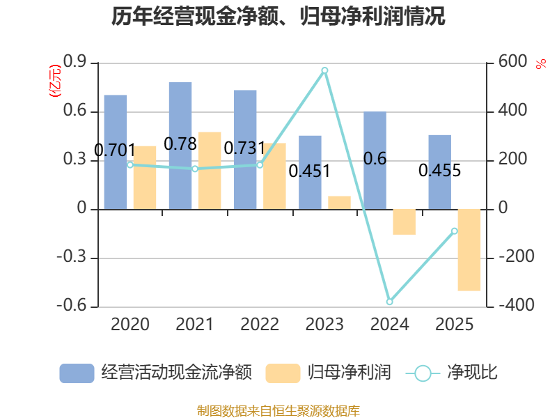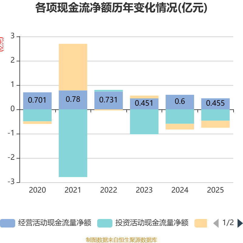截至2025年,公司经营活动现金流净额为4554.68万元,同比下降24.06%;筹资活动现金流净额-2893.69万元,同比减少523.3万元;投资活动现金流净额-4673.94万元,上年同期为-5926.69万元。