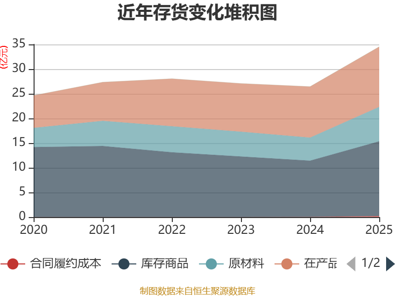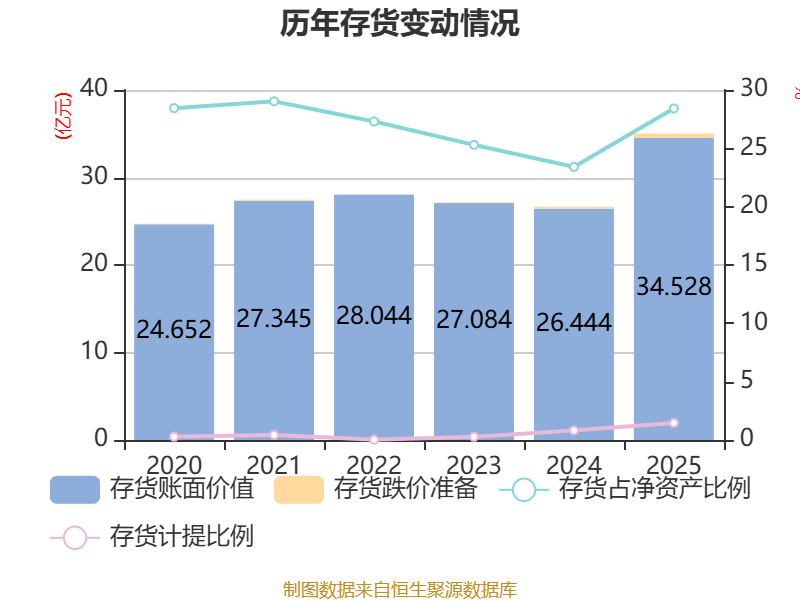 从存货变动来看,截至2025年末,公司存货账面价值为34.53亿元,占净资产的28.42%,较上年末增加8.08亿元。其中,存货跌价准备为5098.47万元,计提比例为1.46%。