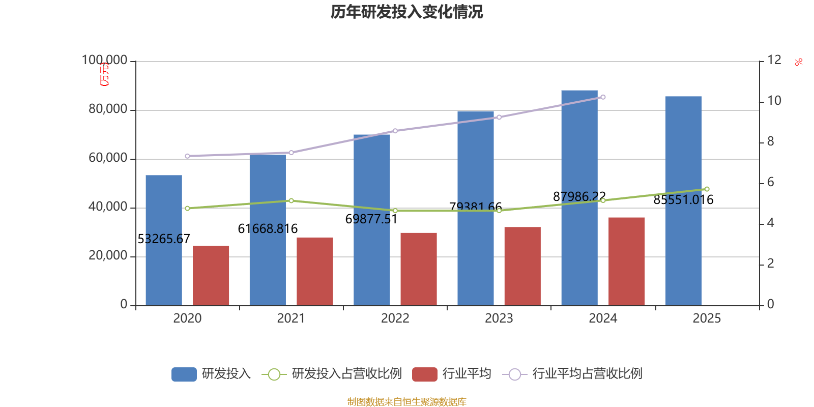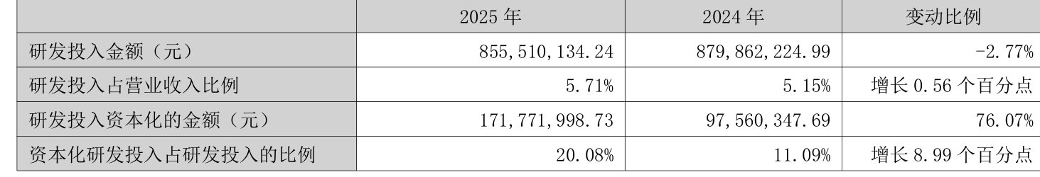 2025年全年,公司研发投入金额为8.56亿元,同比下降2.77%;研发投入占营业收入比例为5.71%,相比上年同期上升0.56个百分点。此外,公司全年研发投入资本化率为20.08%。