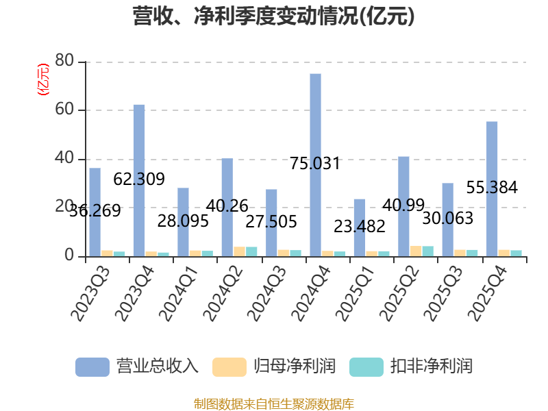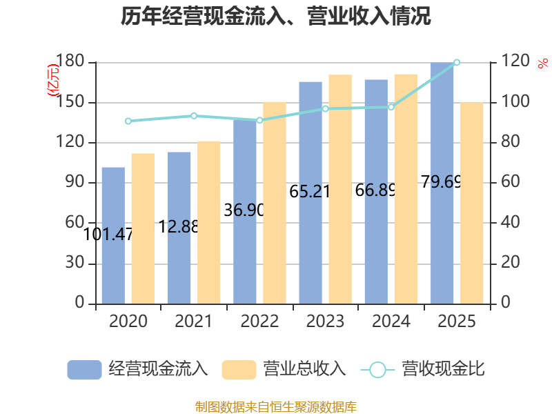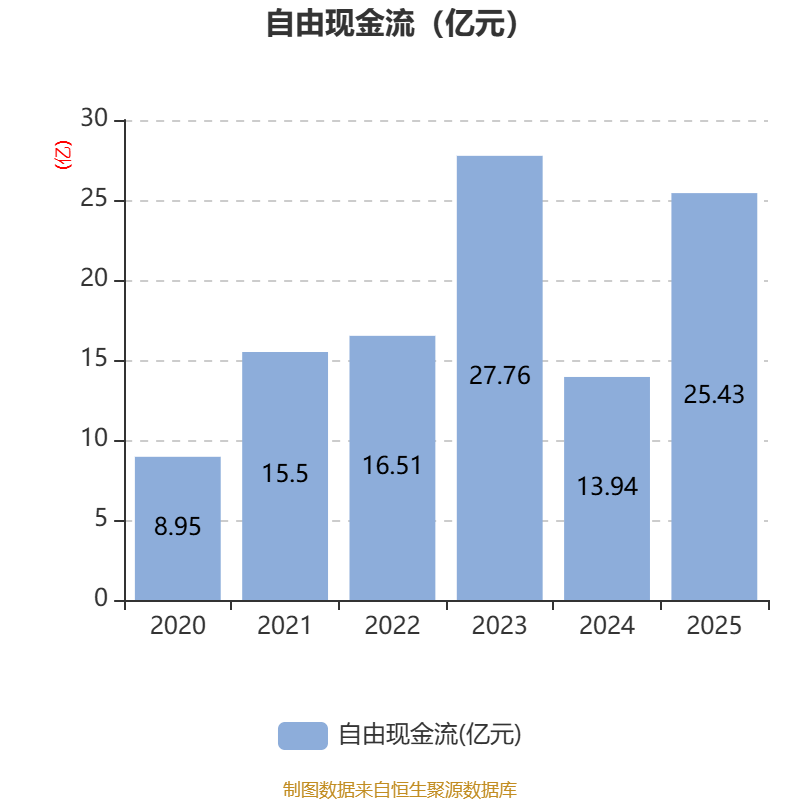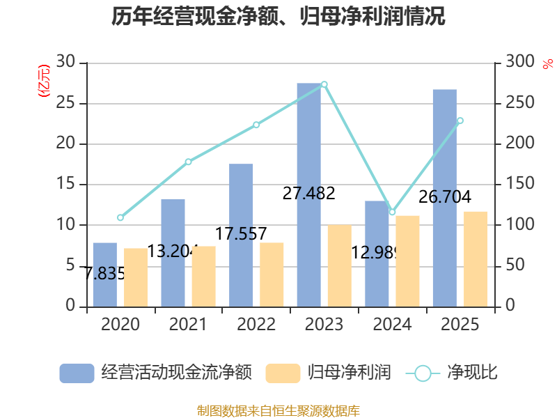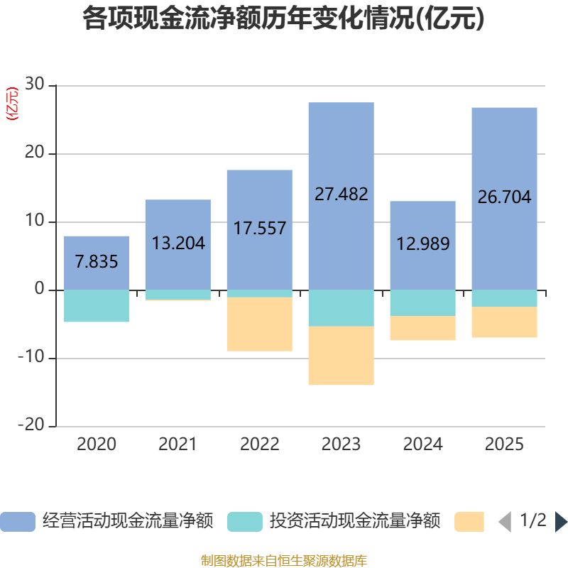 截至2025年,公司经营活动现金流净额为26.7亿元,同比增长105.59%;筹资活动现金流净额-4.51亿元,同比减少9485.27万元;投资活动现金流净额-2.5亿元,上年同期为-3.86亿元。