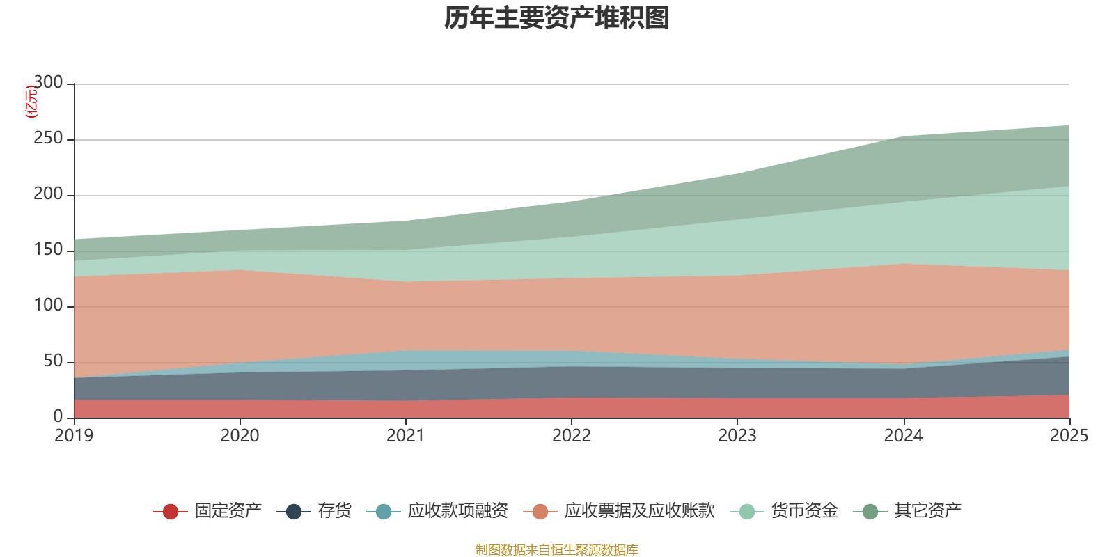 资产重大变化方面,截至2025年末,公司应收票据及应收账款较上年末减少20.92%,占公司总资产比重下降8.54个百分点;货币资金较上年末增加35.51%,占公司总资产比重上升6.69个百分点;存货较上年末增加30.57%,占公司总资产比重上升2.69个百分点;其他应收款(含利息和股利)较上年末减少67.02%,占公司总资产比重下降1.73个百分点。