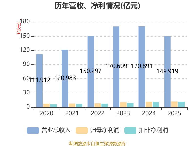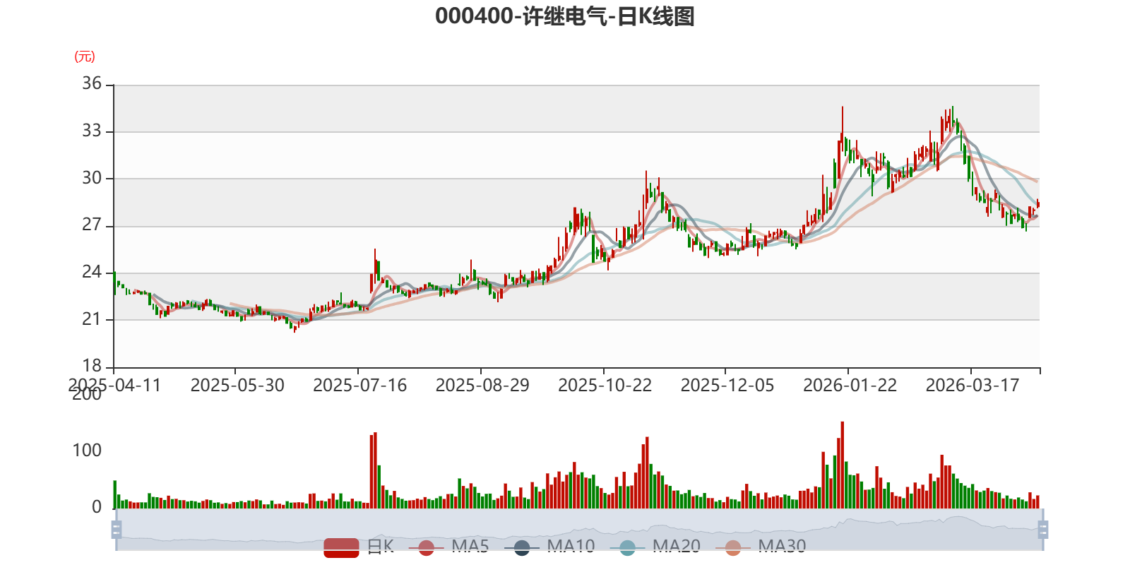 中证智能财讯许继电气(000400)4月11日披露2025年年度报告。2025年,公司实现营业总收入149.92亿元,同比下降12.27%;归母净利润11.67亿元,同比增长4.50%;扣非净利润11.22亿元,同比增长5.64%;经营活动产生的现金流量净额为26.7亿元,同比增长105.59%;报告期内,许继电气基本每股收益为1.1531元,加权平均净资产收益率为9.94%。公司2025年度分配预案为:拟向全体股东每10股派现2.21元(含税)。