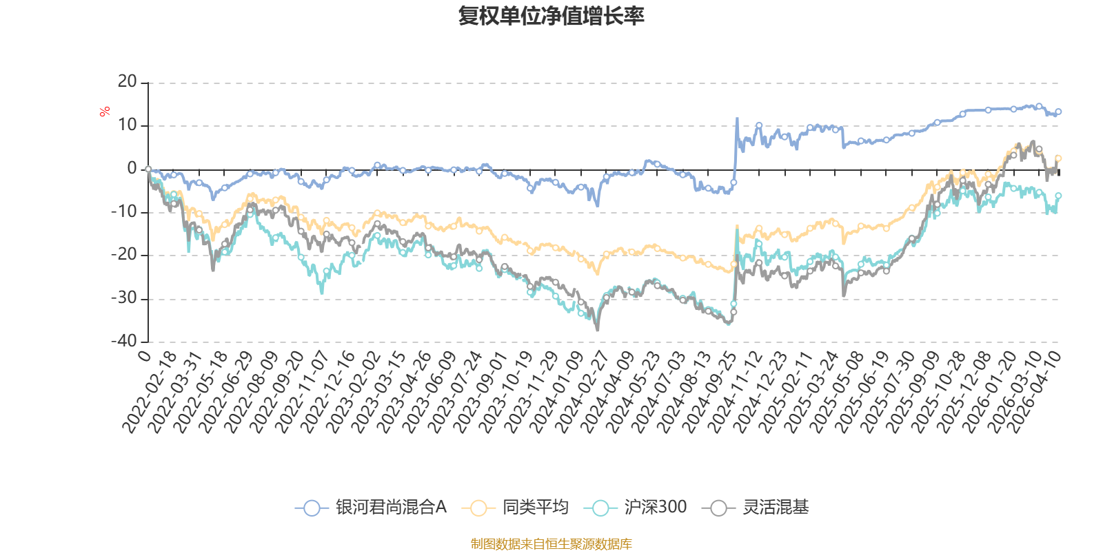 该基金属于灵活配置型基金。截至4月10日,单位净值为1.771元。基金经理是吴欣雨,目前管理的5只基金近一年均为正收益。其中,截至4月10日,银河君尚混合A近一年复权单位净值增长率最高,达7.08%;银河中债0-3年政金债指数A最低,为1.18%。