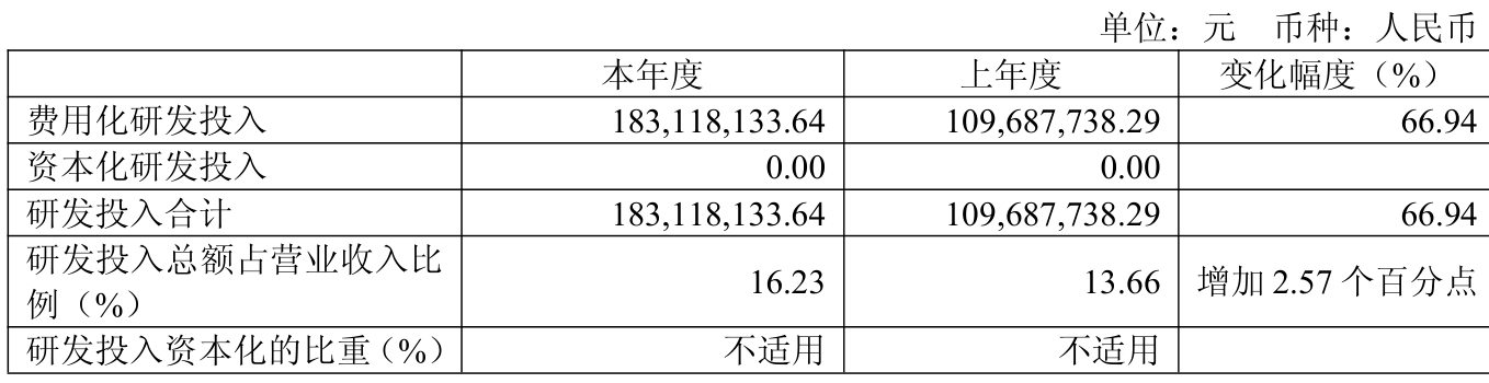 2025年全年,公司研发投入金额为1.83亿元,同比增长66.94%;研发投入占营业收入比例为16.23%,相比上年同期上升2.57个百分点。