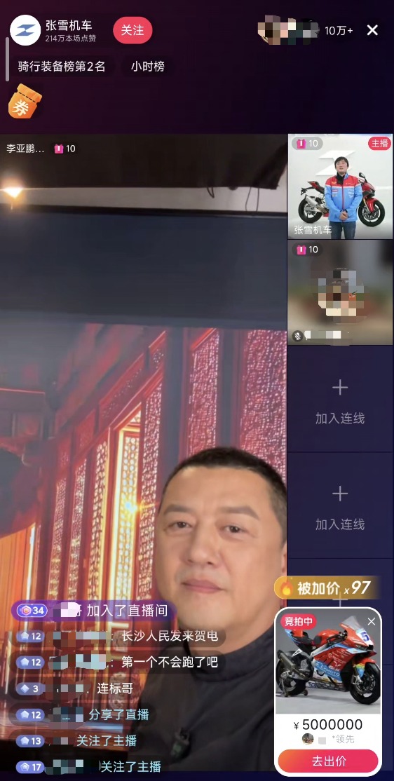 4月10日晚上8点,中国摩托车品牌张雪机车创始人张雪在其直播间拍卖WSBK夺冠车820复刻车赛车,并为拍卖设置了封顶价500万元。按照拍卖规则,竞拍者不能一次性出价500万,只有出价100万以上后一直点,先触达500万者得,有一定运气成分。