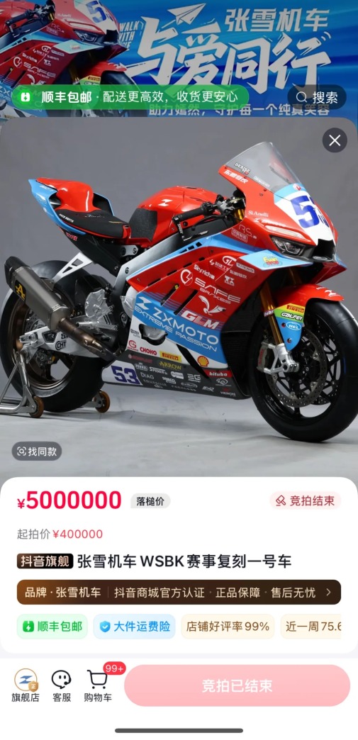 张雪冠军赛车复刻版拍卖直播,不到一分钟500万封顶成交!后视频连线李亚鹏