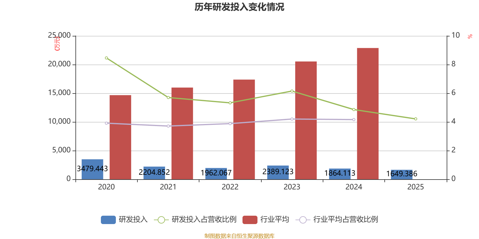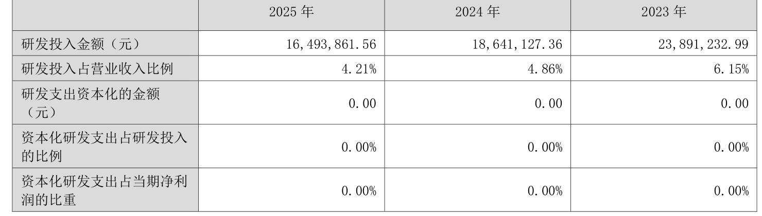 2025年全年,公司研发投入金额为1649.39万元,同比下降11.52%;研发投入占营业收入比例为4.21%,相比上年同期下降0.65个百分点。此外,公司全年研发投入资本化率为0%。