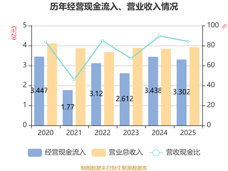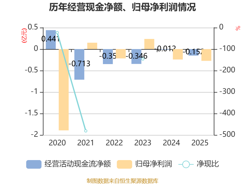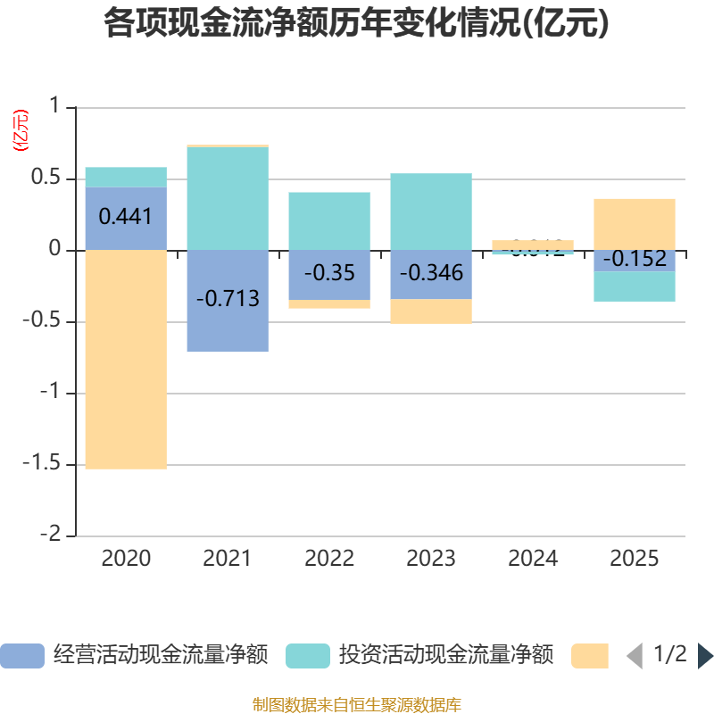截至2025年,公司经营活动现金流净额为-1519.96万元,同比减少1402.98万元;筹资活动现金流净额3573.77万元,同比增加2889.52万元;投资活动现金流净额-2099.08万元,上年同期为-203.61万元。