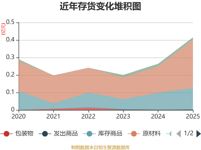 从存货变动来看,截至2025年末,公司存货账面价值为4152.96万元,占净资产的102.34%,较上年末增加1514.57万元。其中,存货跌价准备为232.47万元,计提比例为5.3%。