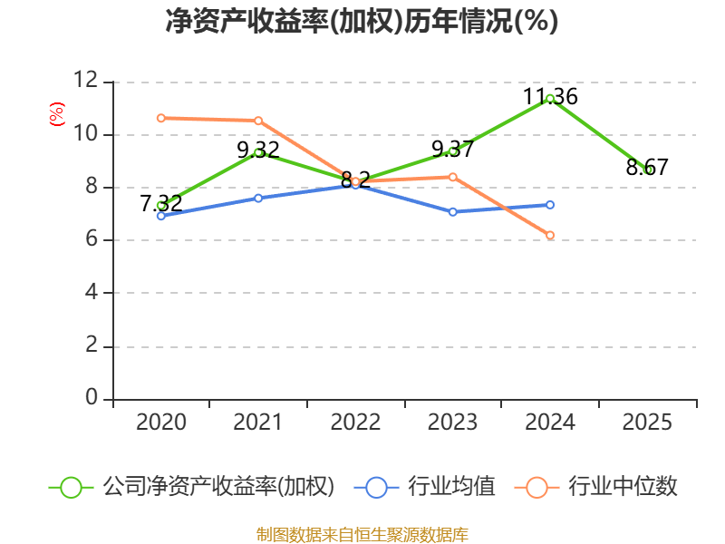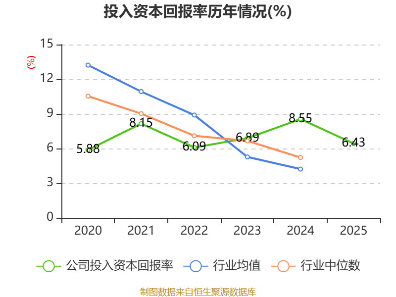 数据显示,2025年公司加权平均净资产收益率为8.67%,较上年同期下降2.69个百分点。公司2025年投入资本回报率为6.43%,较上年同期下降2.12个百分点。