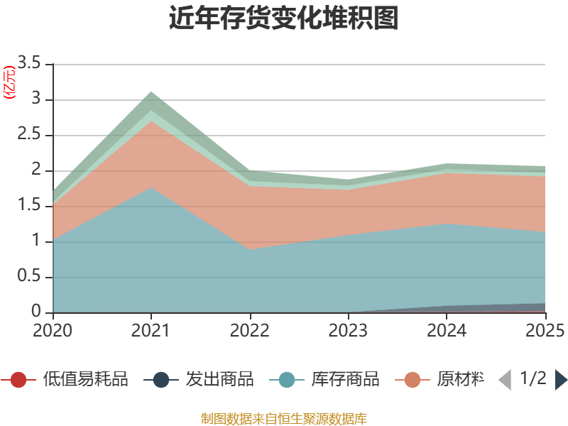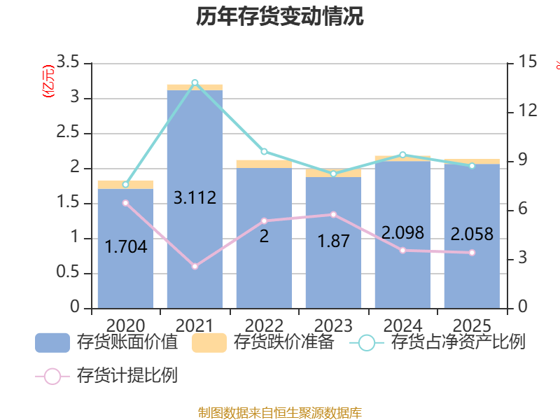 从存货变动来看,截至2025年末,公司存货账面价值为2.06亿元,占净资产的8.7%,较上年末减少402.2万元。其中,存货跌价准备为721.58万元,计提比例为3.39%。