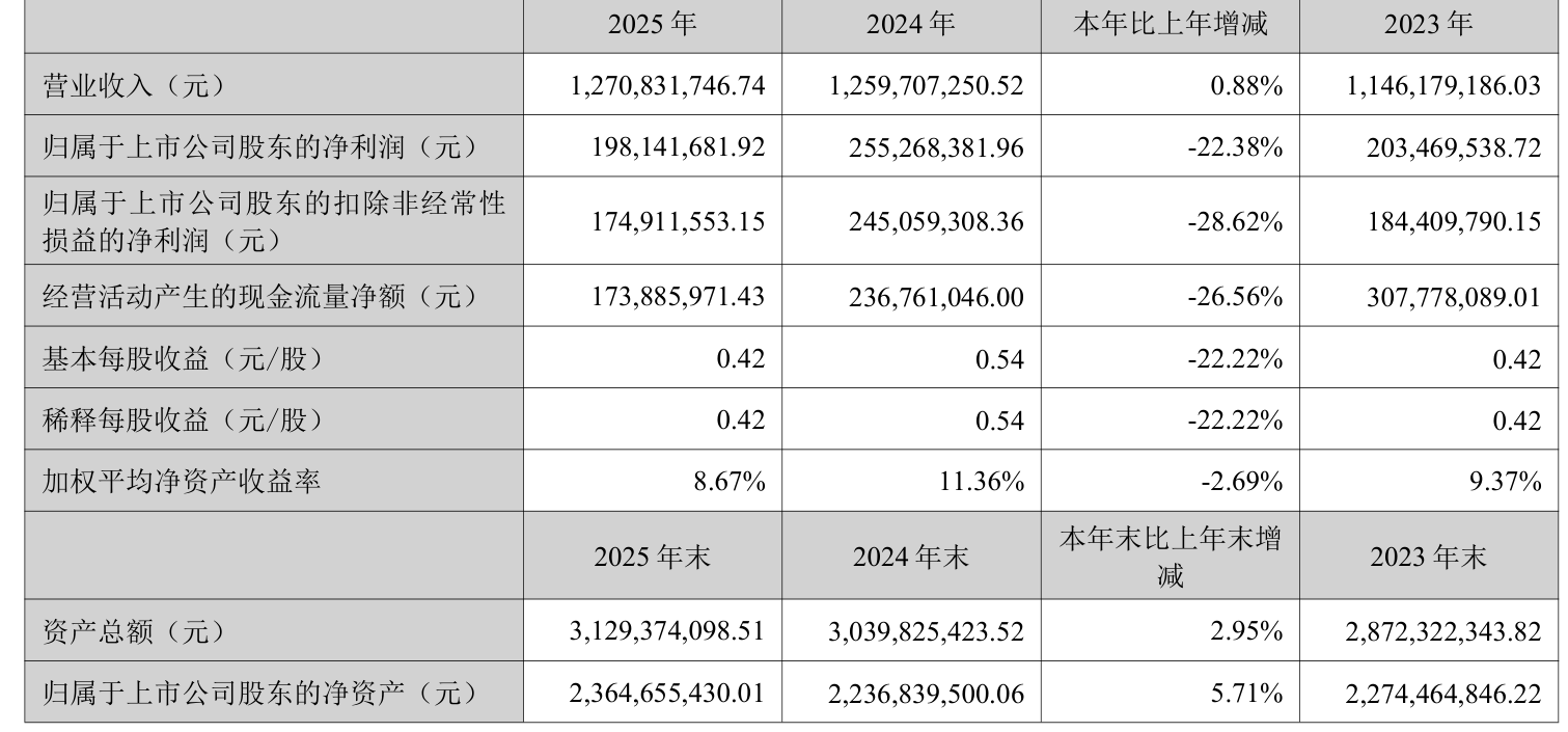 中证智能财讯佳士科技(300193)4月11日披露2025年年度报告。2025年,公司实现营业总收入12.71亿元,同比增长0.88%;归母净利润1.98亿元,同比下降22.38%;扣非净利润1.75亿元,同比下降28.62%;经营活动产生的现金流量净额为1.74亿元,同比下降26.56%;报告期内,佳士科技基本每股收益为0.42元,加权平均净资产收益率为8.67%。公司2025年度分配预案为:拟向全体股东每10股派现3元(含税)。