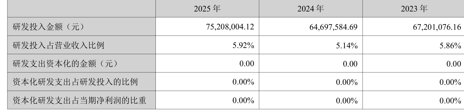 2025年全年,公司研发投入金额为7520.8万元,同比增长16.25%;研发投入占营业收入比例为5.92%,相比上年同期上升0.78个百分点。此外,公司全年研发投入资本化率为0%。